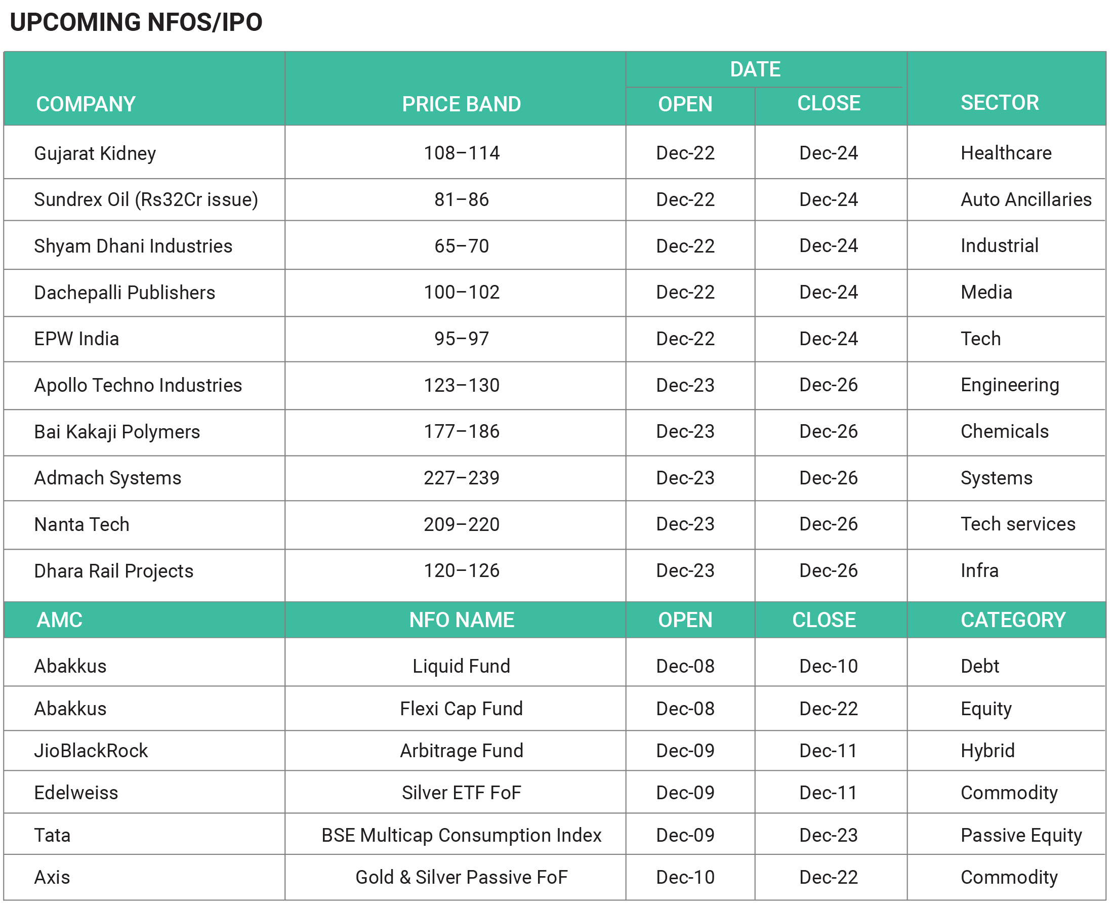 The divergence between foreign selling and domestic buying prevented deeper drawdowns, kept market breadth tilted toward liquid frontline stocks, and reinforced the perception that domestic capital had become the marginal price-setter. Sectoral performance was notably differentiated compared with November’s broad-based rally: IT stocks benefited from sustained global demand for digital and AI-linked services and from rupee weakness, which supported earnings translation and margins; healthcare and pharma held up well as defensive plays with stable demand visibility, particularly in domestic-focused names and hospital chains; energy stocks outperformed on value buying and policy support, with integrated and downstream players aided by lower crude prices and expectations of healthy refining margins; financials delivered mixed but generally supportive performance, with PSU banks and select rate-sensitive lenders gaining on expectations of strong credit growth and an accommodative policy path, while some private banks faced intermittent pressure due to concerns around net interest margin compression and pockets of asset-quality stress; consumer sectors saw profit-taking in FMCG after earlier resilience despite improving volume trends and easing inflation, while discretionary stocks were stock-specific, with autos supported by demand and rate-cut hopes but retail names consolidating after sharp prior rerating; utilities remained among the weaker segments, as concerns around tariffs, demand visibility and operational pressures capped enthusiasm, limiting buying to balance-sheet-strong names; and metals and industrials moved in a choppy but mildly positive fashion toward month-end, helped by import-related policy measures, domestic capex expectations and year-end positioning despite uneven global demand indicators. The macro backdrop during the month remained largely supportive domestically: Q2 FY25 GDP growth around 8% exceeded expectations, inflation stayed benign, and the RBI delivered a dovish policy signal by cutting the repo rate by 25 basis points to 5.25%, announcing ₹1 trillion in open market operations and a USD 5 billion buy/sell swap to inject liquidity, which helped soften bond yields and underpin sentiment. However, these positives were tempered by external pressures, including a firm US dollar, weak emerging-market currencies, geopolitical uncertainty, US trade policy risks, China’s deflationary signals, and falling crude prices, all of which reinforced caution among foreign investors. The rupee’s nearly 2% depreciation over the month weighed on foreign returns but also highlighted India’s relative resilience: instead of triggering disorderly selling, equities absorbed the shock through sideways movement as domestic flows cushioned the impact. By year-end, market positioning clearly favoured quality, earnings visibility and balance-sheet strength over high-beta momentum, with index valuations cooling modestly from peak optimism but remaining supported by earnings delivery and liquidity. Overall, December 2025 closed with Indian equities in a deliberate, balanced stance: headline indices near record highs but without exuberance, foreign investors cautious but not capitulating, domestic institutions firmly in support, and the market entering 2026 consolidated, selective and grounded in fundamentals rather than momentum.